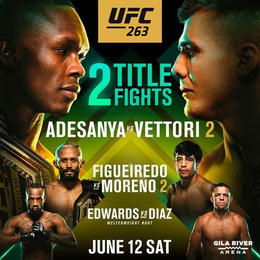 UFC Books Israel Adesanya vs Marvin Vettori 2 as UFC 263 Headliner on June 12 Two Ultimate Fighting Championship belts will now be on the line at the tentpole event in June Per UFC President We'll be tracking the results all night during UFC 263 from Phoenix on June 12, through the main event of Israel Adesanya vs Marvin Vettori By Collin Sherwin @CollinSherwin Updated , 1018pm PDTThe official home of Ultimate Fighting Championship Enjoy the latest breaking news, fights, behidnthescenes access and more